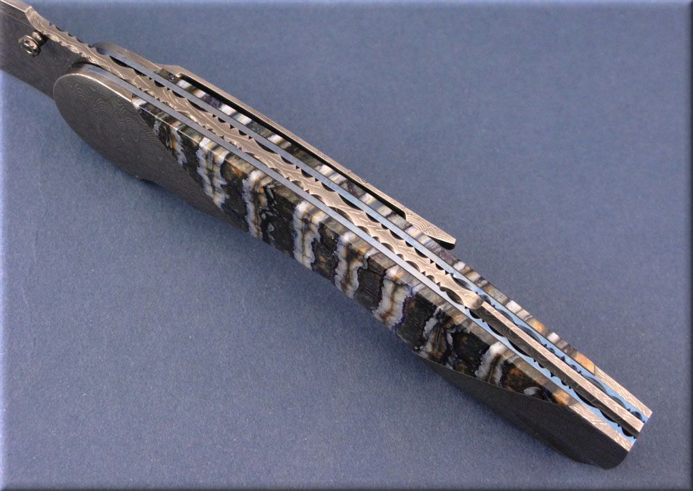 Mike Norris stainless Crazylace damascus blade, bolsters, spine and thumbstud.