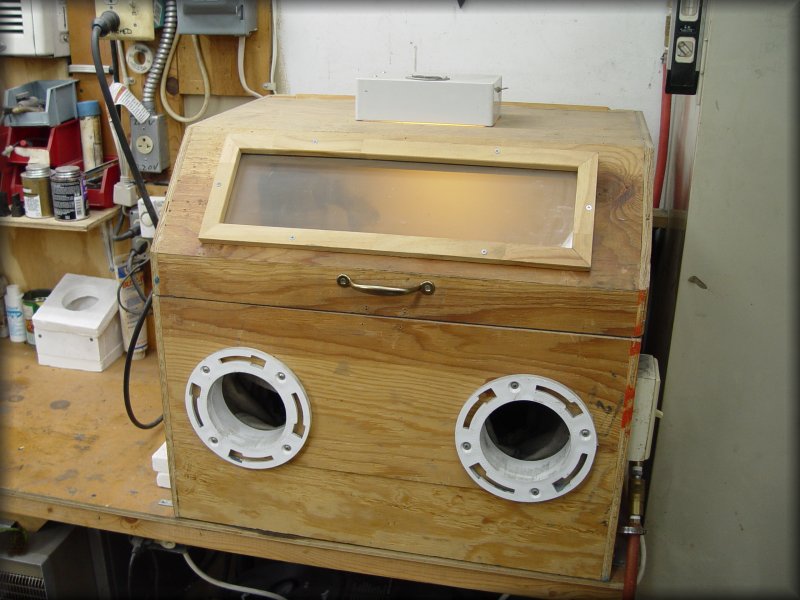 Home built blast cabinet. I salavaged the gun and gloves from a huge cabinet The only thing I had to buy to complete this was the toilet bowl flanges used to mount the gloves. Total cost less than 10 bucks.