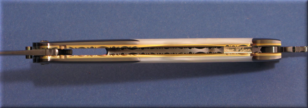 Robbie Thomas Damascus blade, bolsters, spines and latch.